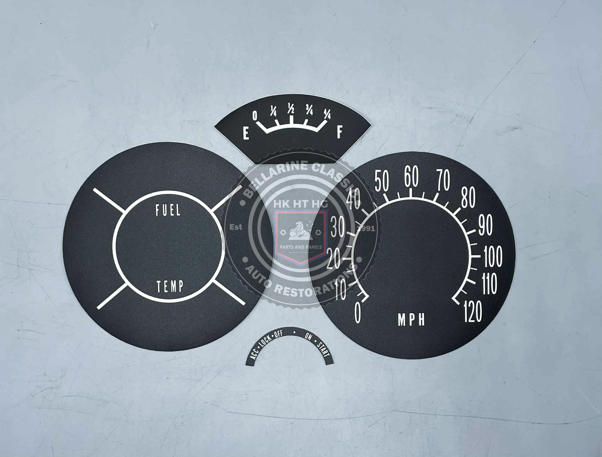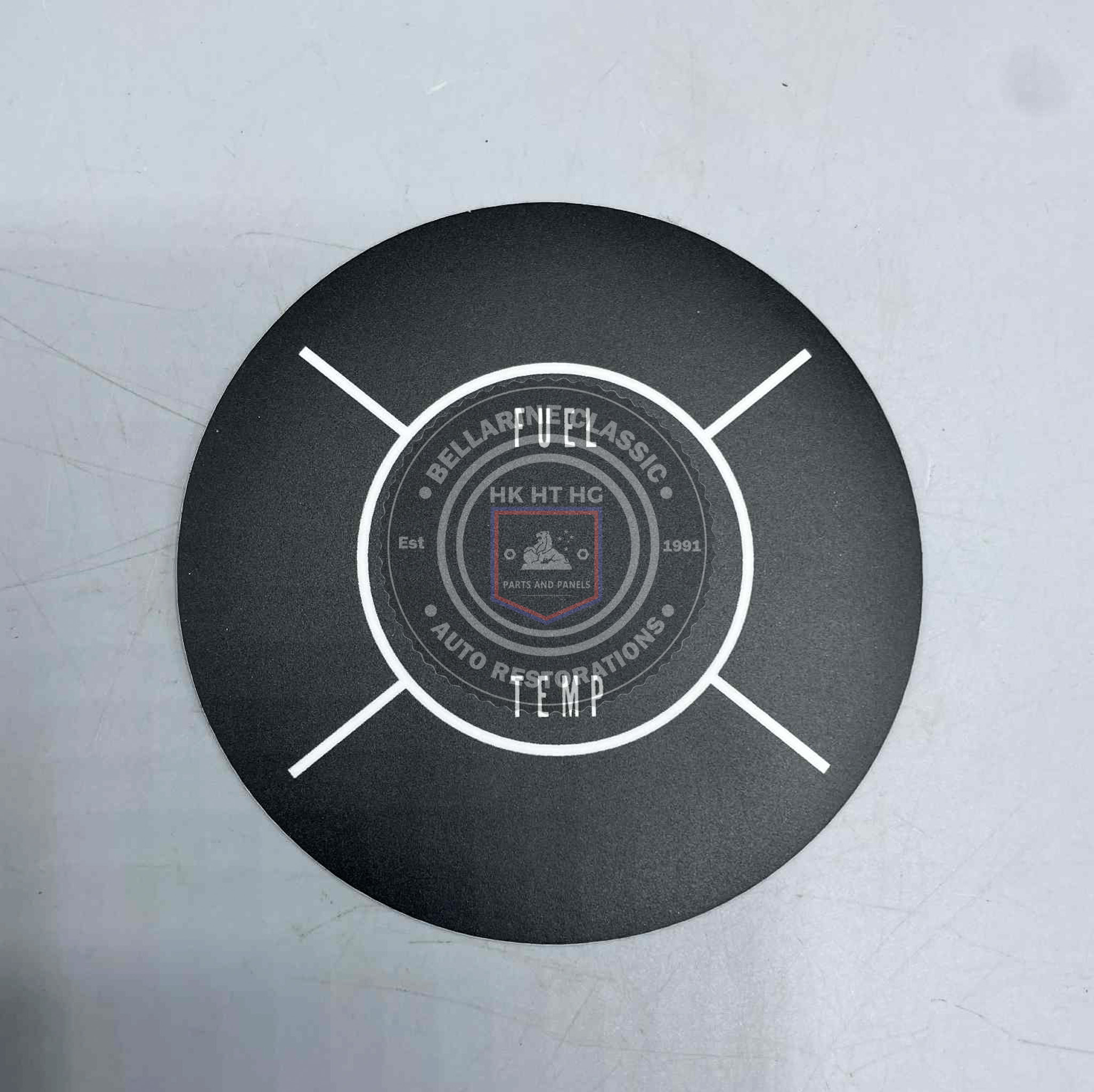 A 4 pce black textured vinyl decal set to replace the gauge faces and lettering of a HT HG standard dash.